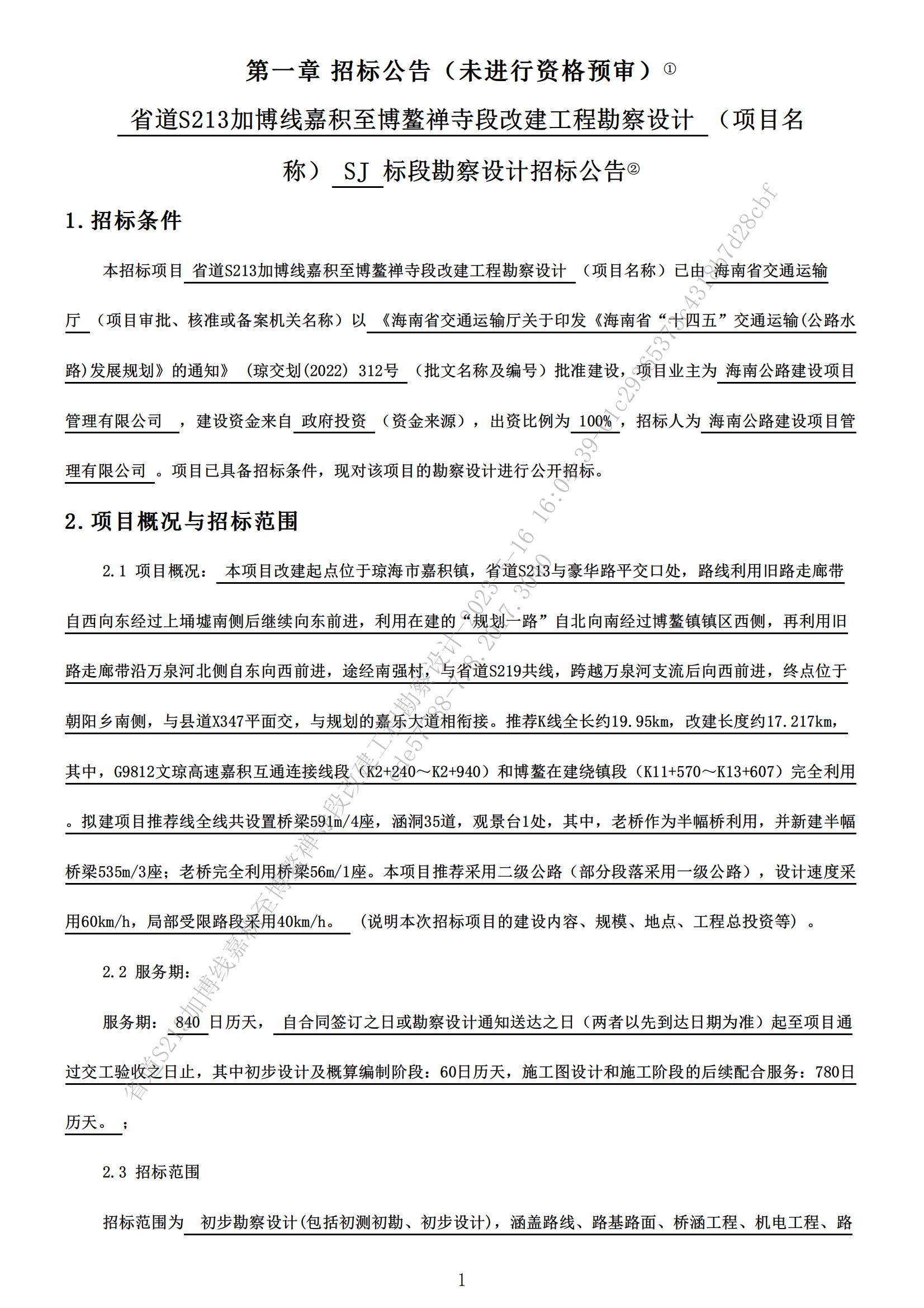 省道 S213 加博線嘉積至博鰲禪寺段改建工程勘察設(shè)計(jì)招標(biāo)公告